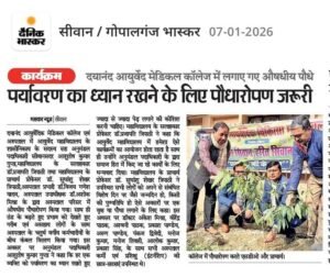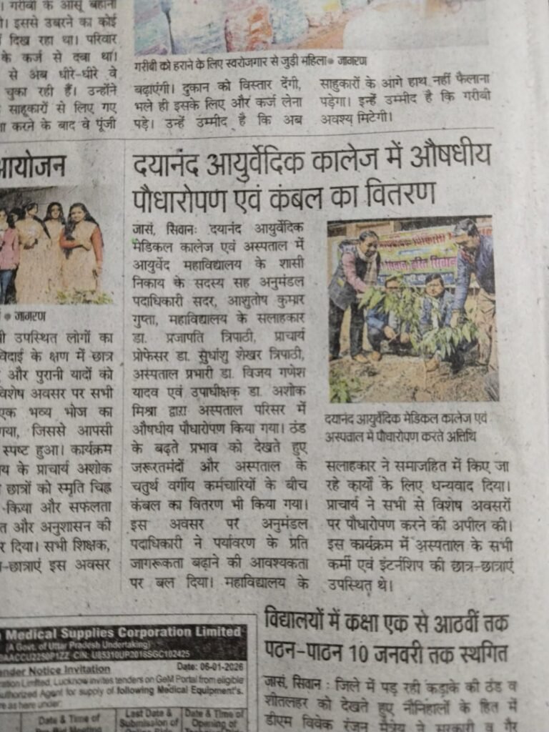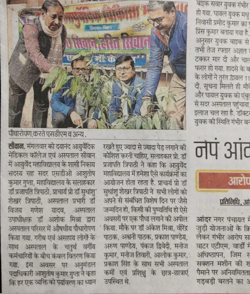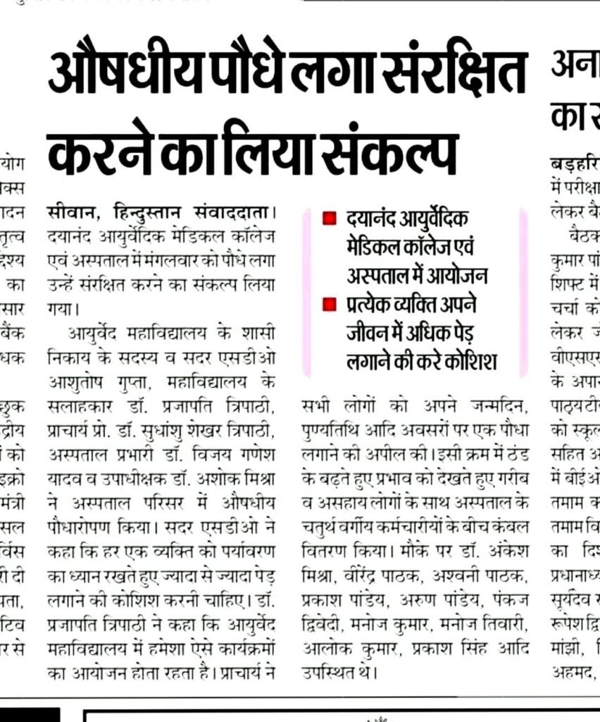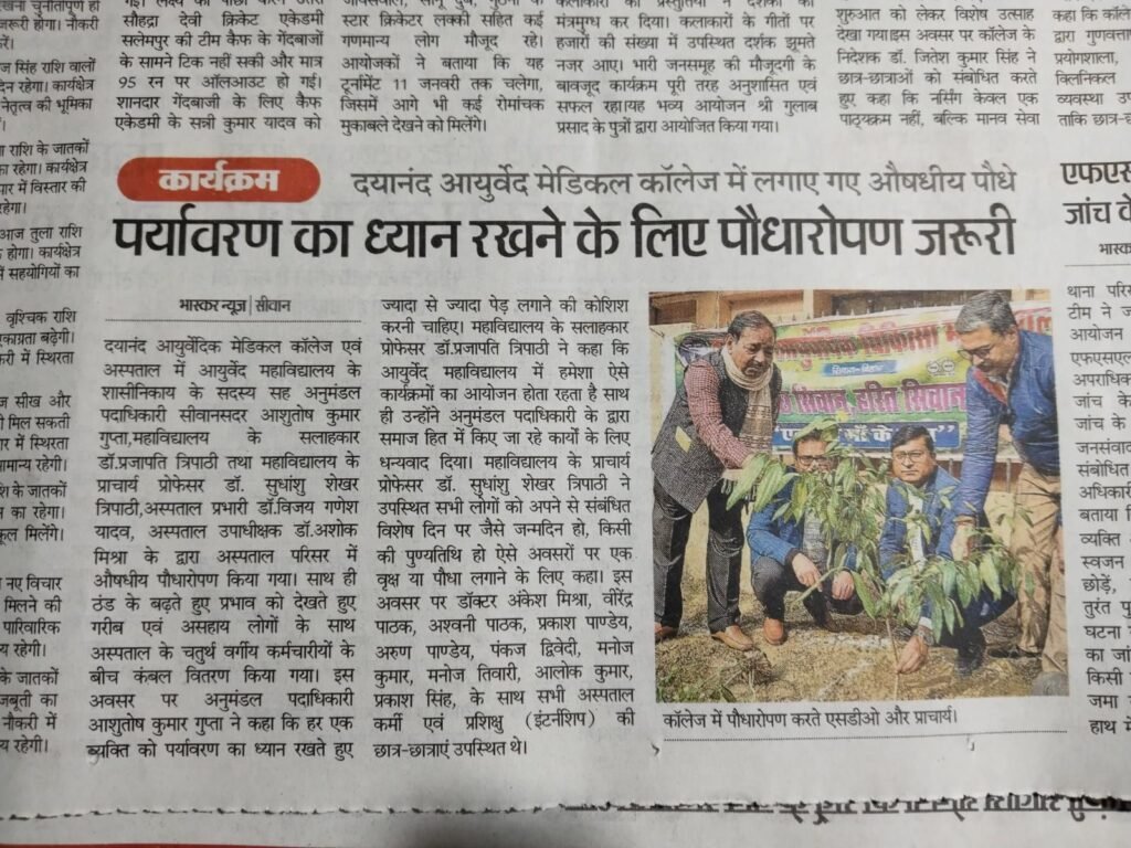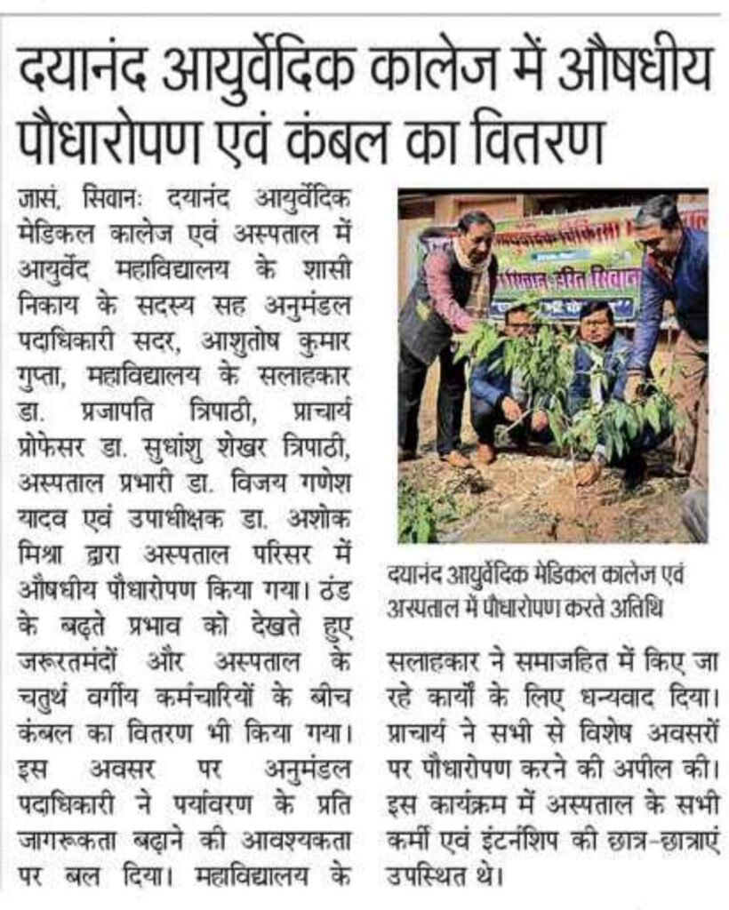 एक पेड़ माँ के नाम आज दिनांक 6 जनवरी 2026 को दयानंद आयुर्वेदिक मेडिकल कॉलेज एवं अस्पताल में श्री आशुतोष गुप्ता (अनुमंडल पदाधिकारी)सिवान सदर सह सदस्य शासी निकाय के द्वारा औषधीय पौधा रोपण एवं जरुरतमंदो के बीच कम्बल वितरण किया गया। Jan 6, 2026 Ravi Shastri