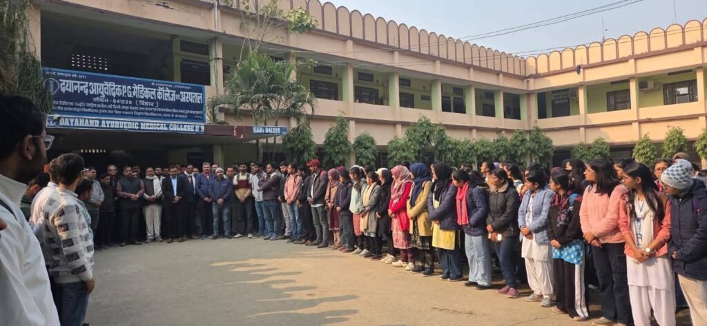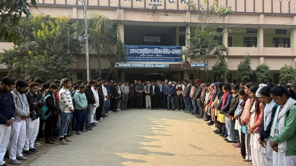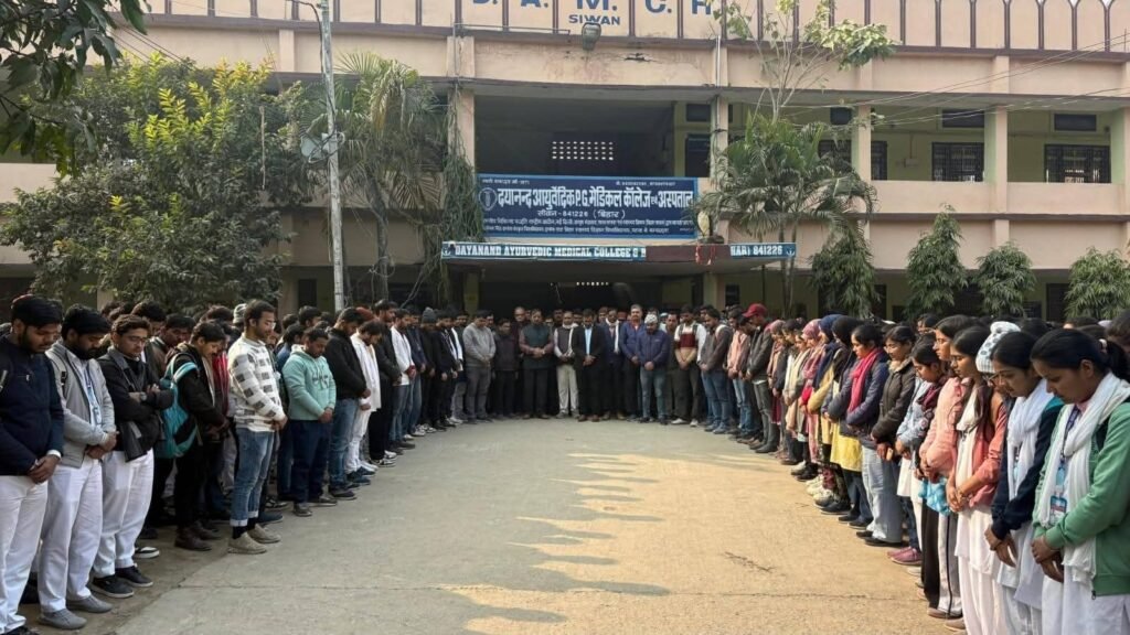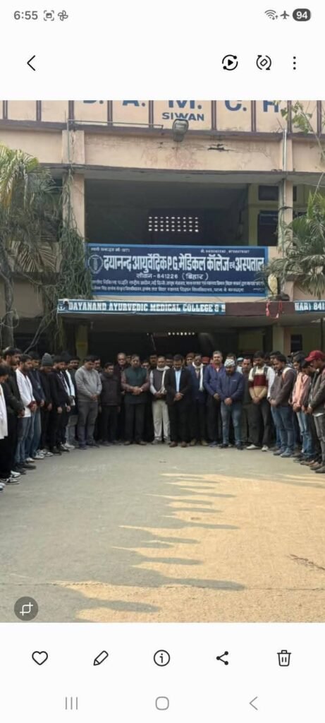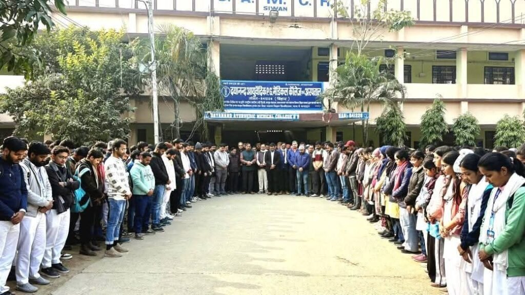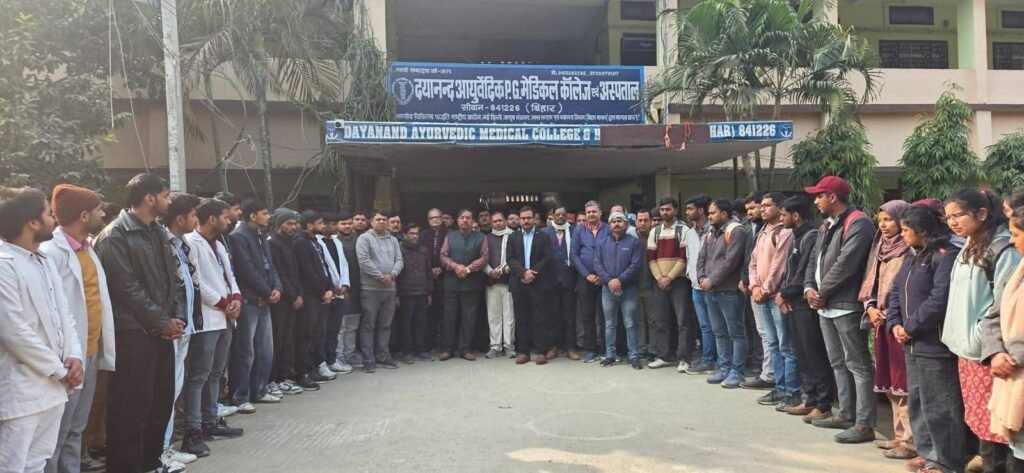 दिनांक 16/01/2026 को दयानन्द आयुर्वेदिक मेडिकल कॉलेज एवं अस्पताल, सिवान में महाविधालय के वाहन चालक श्री चंदेश्वर सिंह जी के आसामयिक गोलोक गमन पर शोकाकुल सहकर्मियों के द्वारा एक श्रद्धांजलि सभा का आयोजन किया गया।
