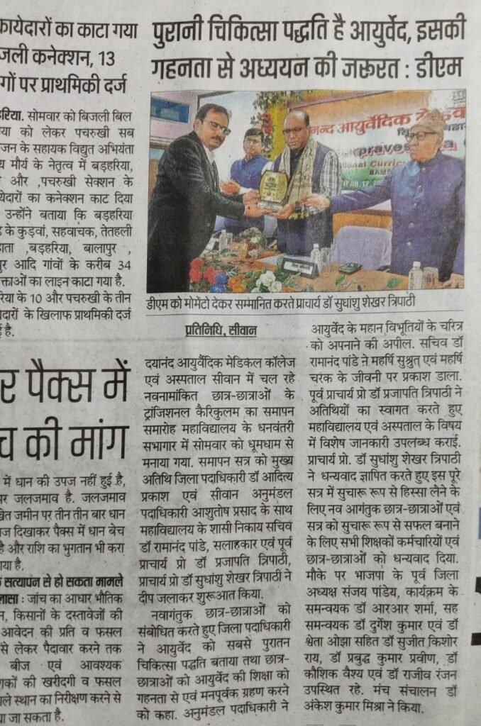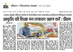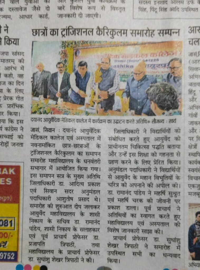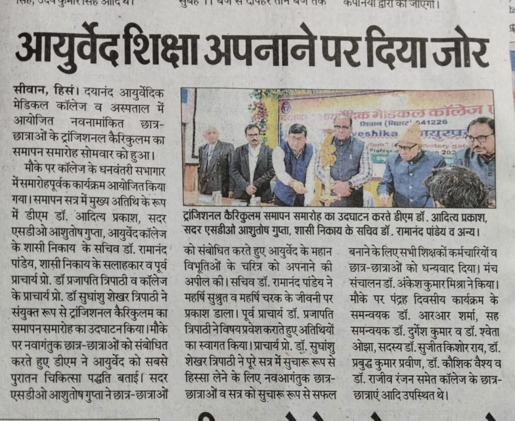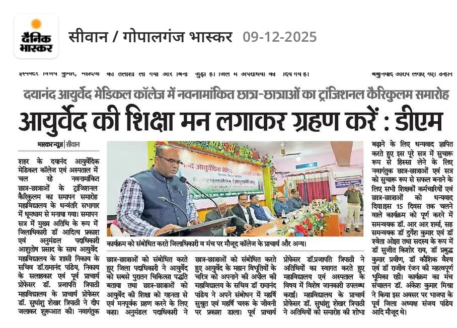 सत्र 2025-26 में नवनामांकित छात्रों का 15 दिवसीय आयुर्वेद विद्या समारम्भ (Transitional Curriculam)कार्यक्रम का समापन समारोह दिनांक 08/12/2025 को सम्पन्न हुआ। दिनांक 09/12/2025 को विभिन्न समाचार पत्रों दैनिक भास्कर,आज, दैनिक जागरण एवं हिन्दुस्तान में प्रकाशित खबर।